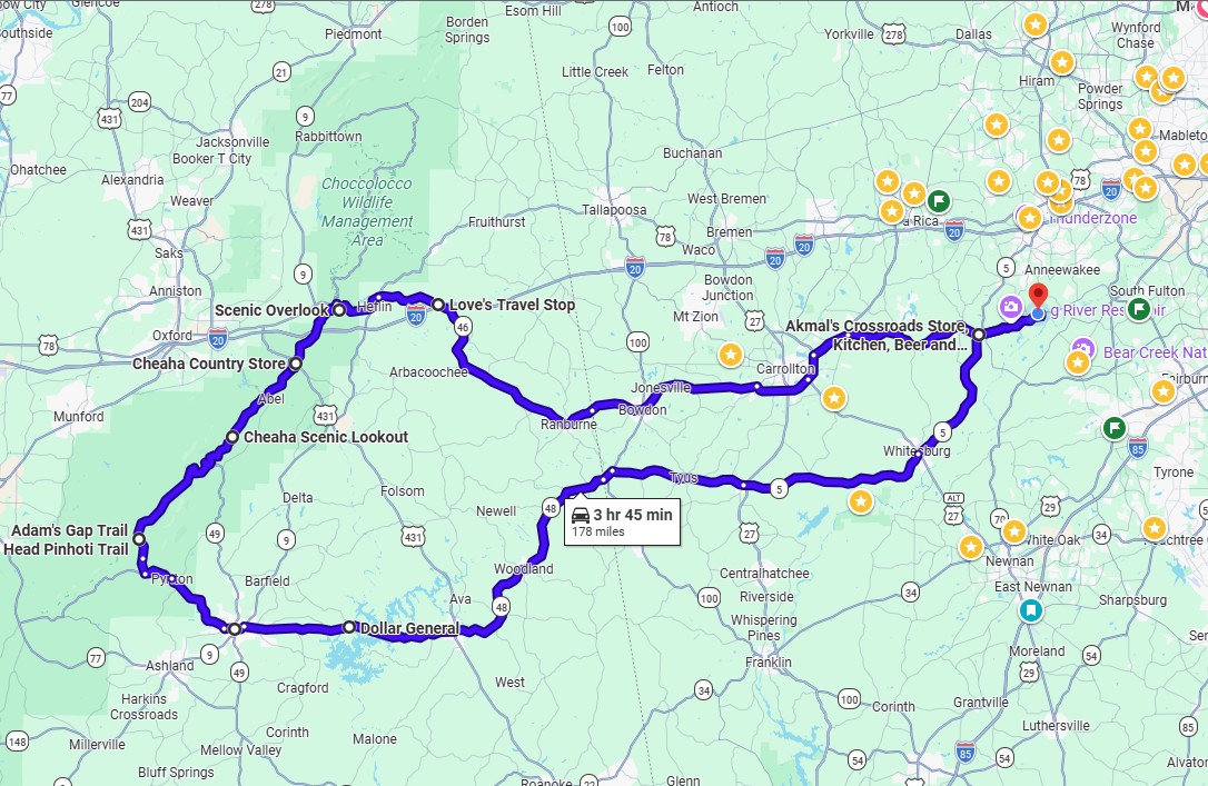 The planned ride into Alabama with Tristan as Pillon was to ride into Alabama from Douglasville, Georga on Georgia Highway 5 / Alabama Highway 48, grab a quick lunch in Lineville, Alabama and then ride north on Alabama Highway 281 through the Talladega National Forest and then back to Douglasville, GA via non-interstate for a planned total of 178 miles roundtrip.