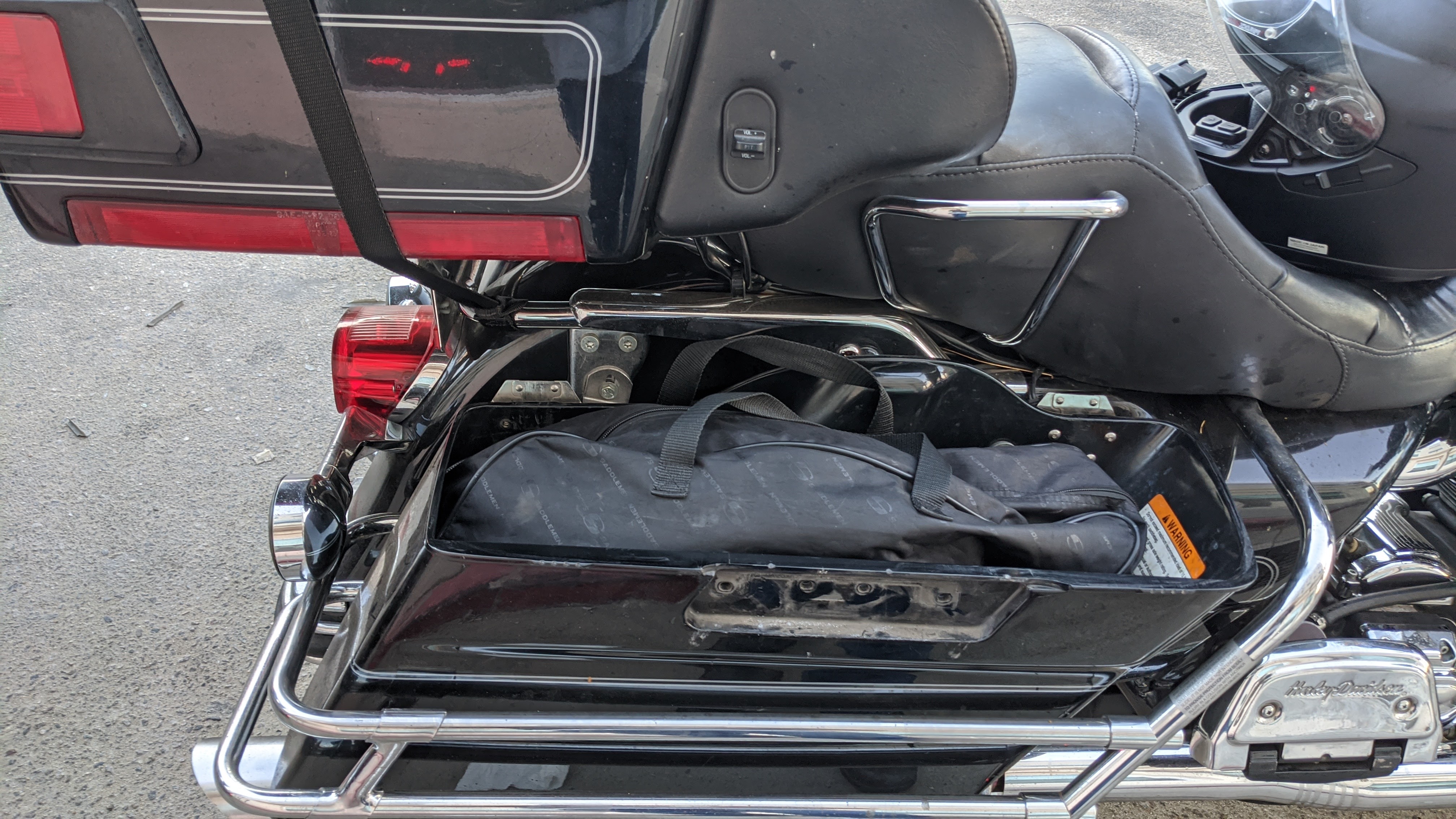 During this ride, I didn’t bother locking the cover as I had my Saddleman fitted bag with everything contained in the bag. I was not worried about losing anything. While I was lane splitting on PCH, some guy in a nice SRT8 Charger .yelled something at me and started honking. I didn’t hear what he was yelling but the tone was not a “Hey you A-hole” tone. It was more of a OMG you are on fire tone. Well, thankfully I was not on fire. I continued to slowly lane split to reach the traffic signal. While stopped at the traffic signal, I reached back to check if my cover was loose, yep it was. Once the light turned green, I rolled through the intersection and then pulled over to the side of the road to re secure the cover with the plan to go ahead and lock it. To my surprise, what I discovered instead was that all of the screws that secure the cover to the bag had fallen out. Wow, OK then. I took a few moments to ponder the situation and see if I could do anything to MacGyver it on the roadside. Ultimately that answer was no. I did not have any bungee cords, rok straps, or anything with me to secure the cover to the bike, so I put the fallen body part into Dexter’s trunk to deal with it later. I was a little nervous about the my bag catching wind and becoming road carnage. But, all was fine for the remainder of the ride.