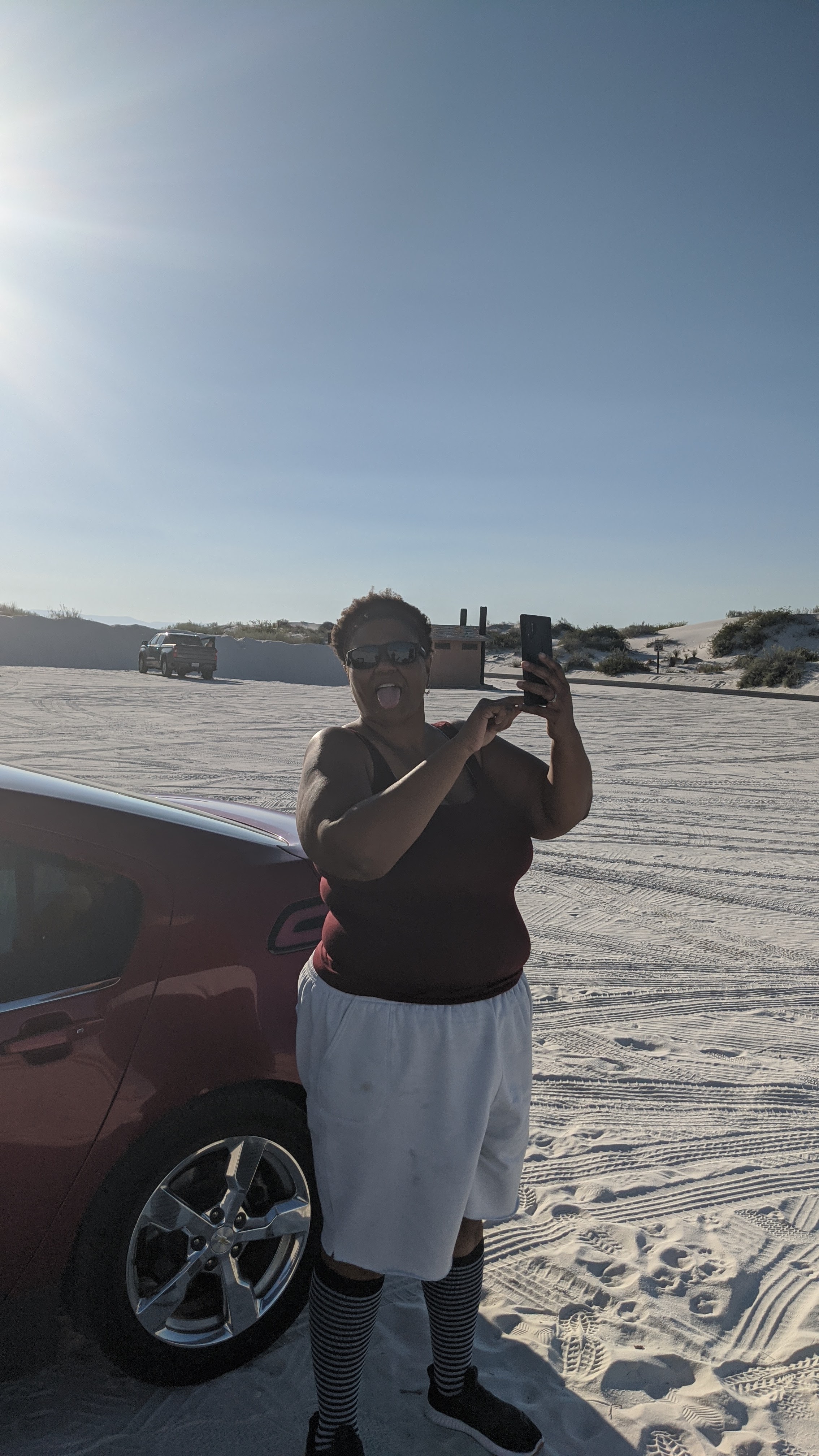 My original plan was to gas up near the motel where we stayed in Las Cruces but there was none immediately near by and we were about 3/4 tank full. I really thought there was at least one gas station between Las Cruces and White Sands….nope just the well armed friendly Border Patrol checkpoint and some empty military land (missile ranges mostly). I did vaguely remember when I was planning a motorcycle route this direction that the town north of the National Park had gasoline. Looked it up on google, yep 16 miles down the road. The Volt was down to 1/4 tank of fuel with the Kia Soul sitting at about half a tank (The Kia has a 9 gallon fuel tank where the Volt has an 8 gallon tank).