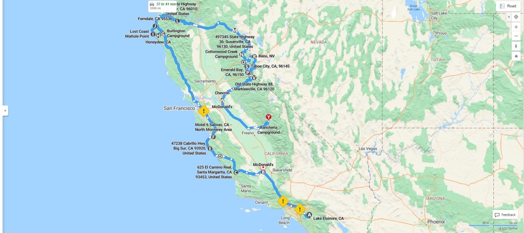 This trip was tour of some of the many iconic areas of California (there are so many). Trip started from Lake Elsinore, CA riding Interstate to Buttonwillow, CA where I catch CA Highway 58 to Santa Margarita, CA and jump on US Highway 101 and roll north to Humboldt Redwoods State Park near Weott, CA where I camped for a few days and explored the unpopulated areas of the Lost Coast.