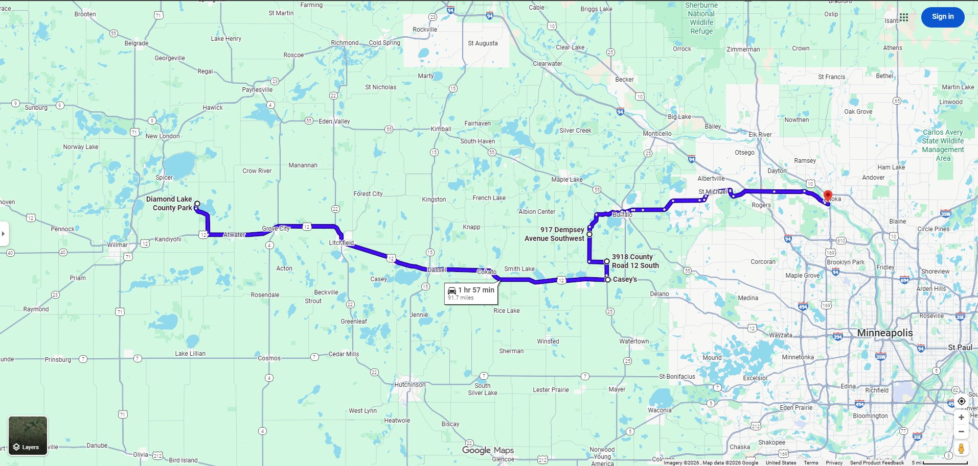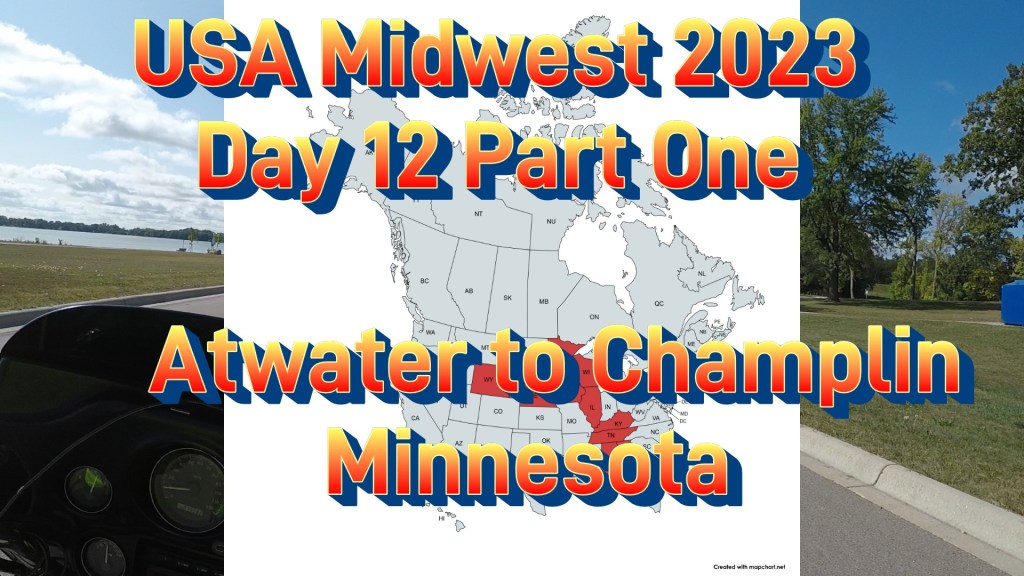 Day 12 starts with my departure from Diamond Lake Count Park near Kandiyohi Minnesota. I rolled south to US Highway 12 and headed east rolling through Atwater, Grove City, Litchfield, Dassel, Cokato, Howard Lake, Waverly and Montrose. From Montrose I roll north through Buffalo and then St Michael, Rogers, Dayton, and finally Champlin.