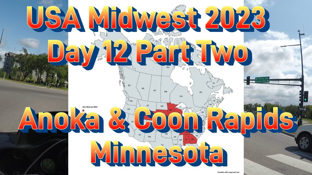 I ride through Anoka, Minnesota and Coon Rapids, Minnesota. Anoka is my hometown, so this was really a ride down memory lane for myself. I take a quick ride (twice) through downtown Anoka on Main Street, have lunch at Riverside Park on the Rum River, ride past Fred Moore where I went to Junior High School (grades 7,8, and 9) and passed Lincoln Elementary where I went to grade school (grades K-6). I also briefly rode by the home I grew up in and quickly toured the neighborhood.
