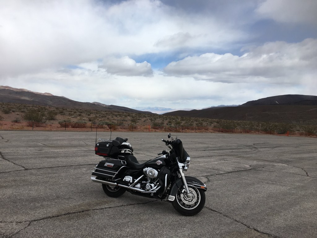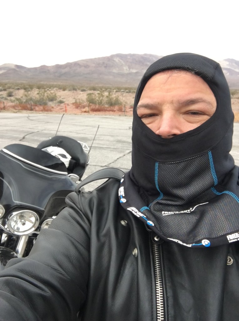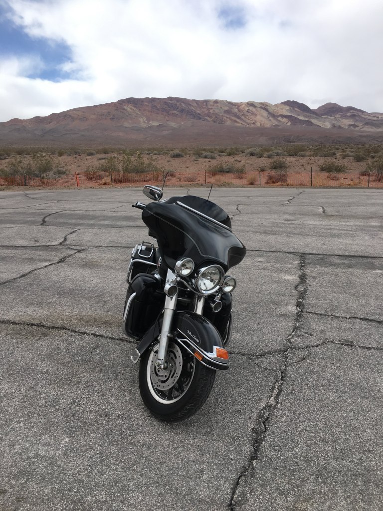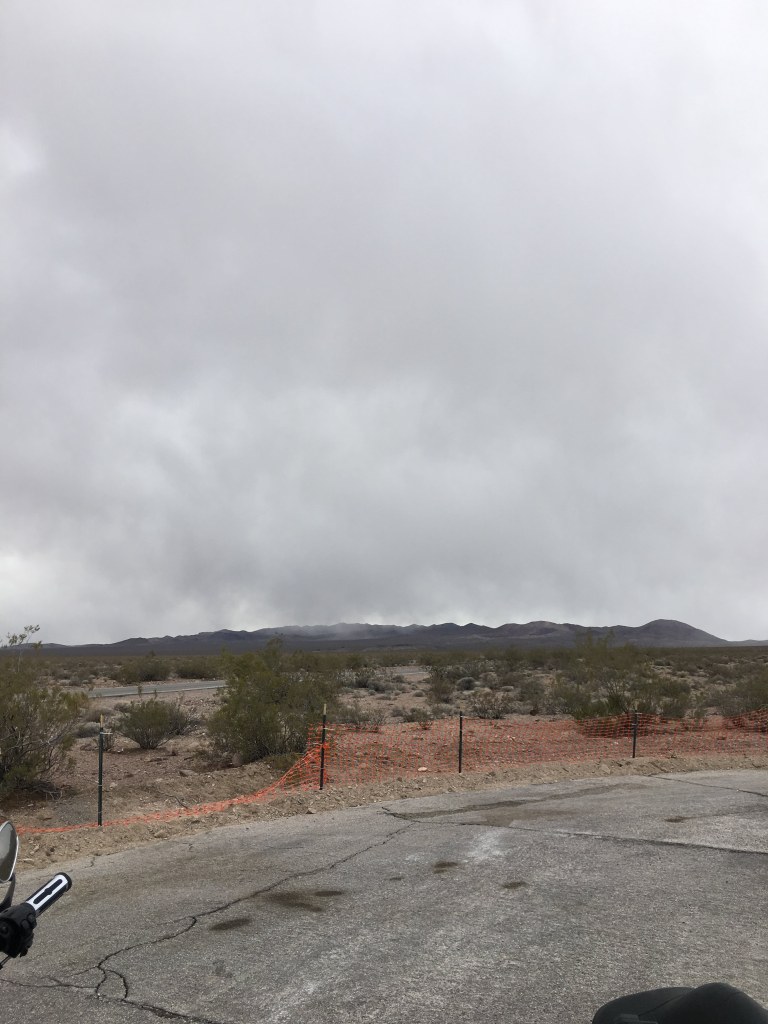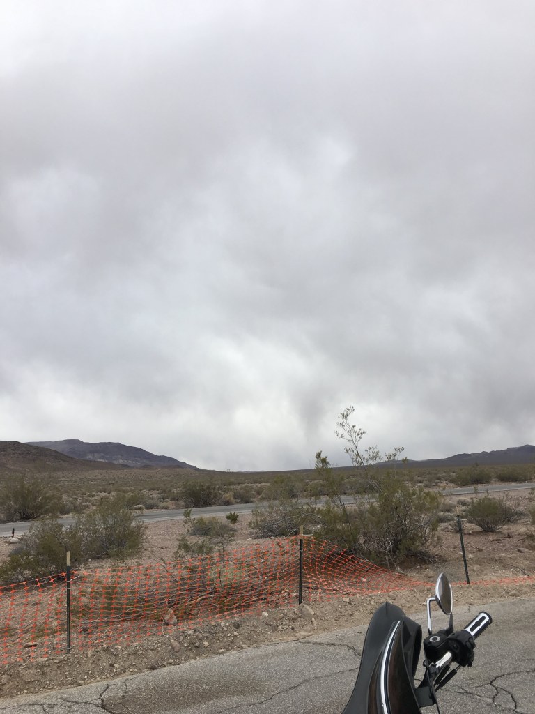 It was a chilly 35° F when I rolled out of Beatty, Nevada. I encountered snow twice on this trip, first time it was snowing (though most were evaporating before hitting the ground) near Dantes View and I ran into more light snow while fueling up in Shoshone, California. This snow was making it to the ground but was not accumulating much (thank God).