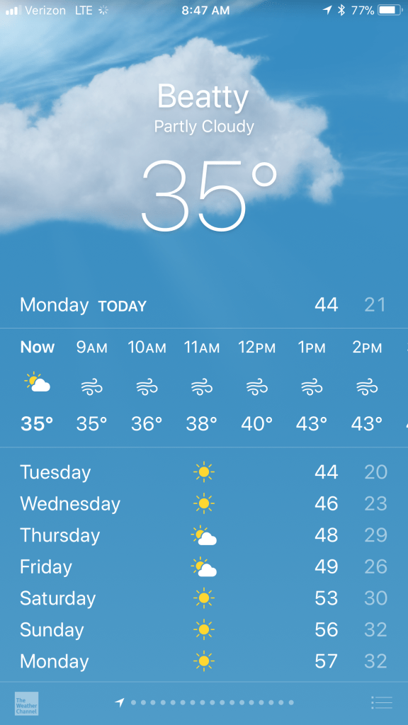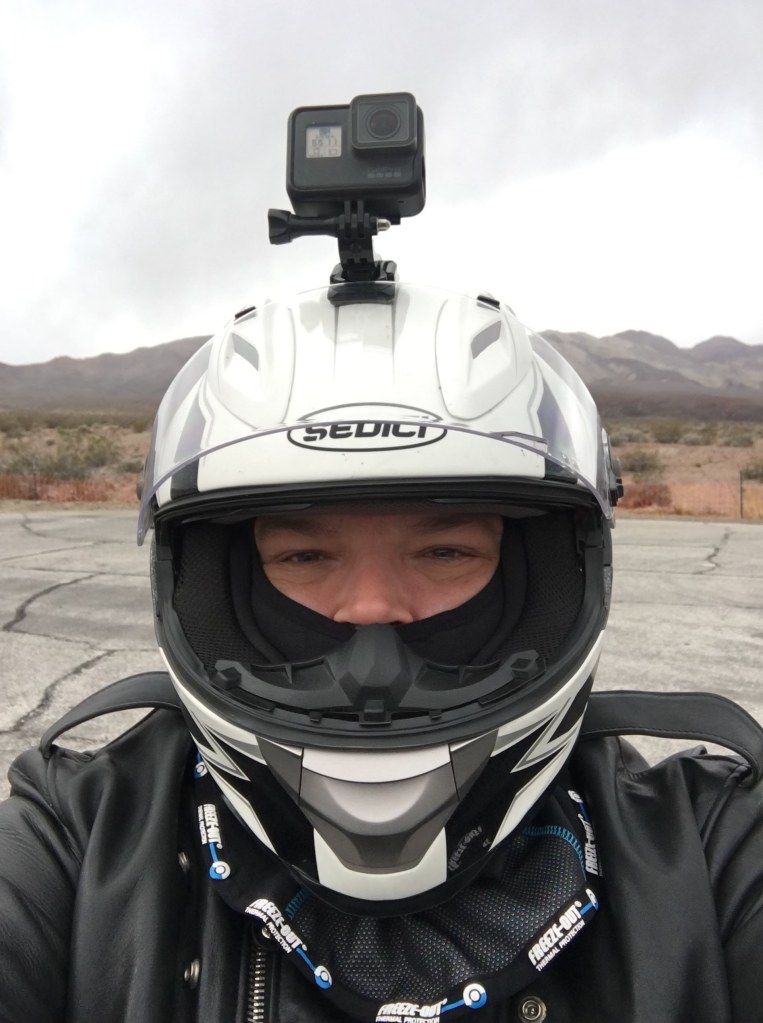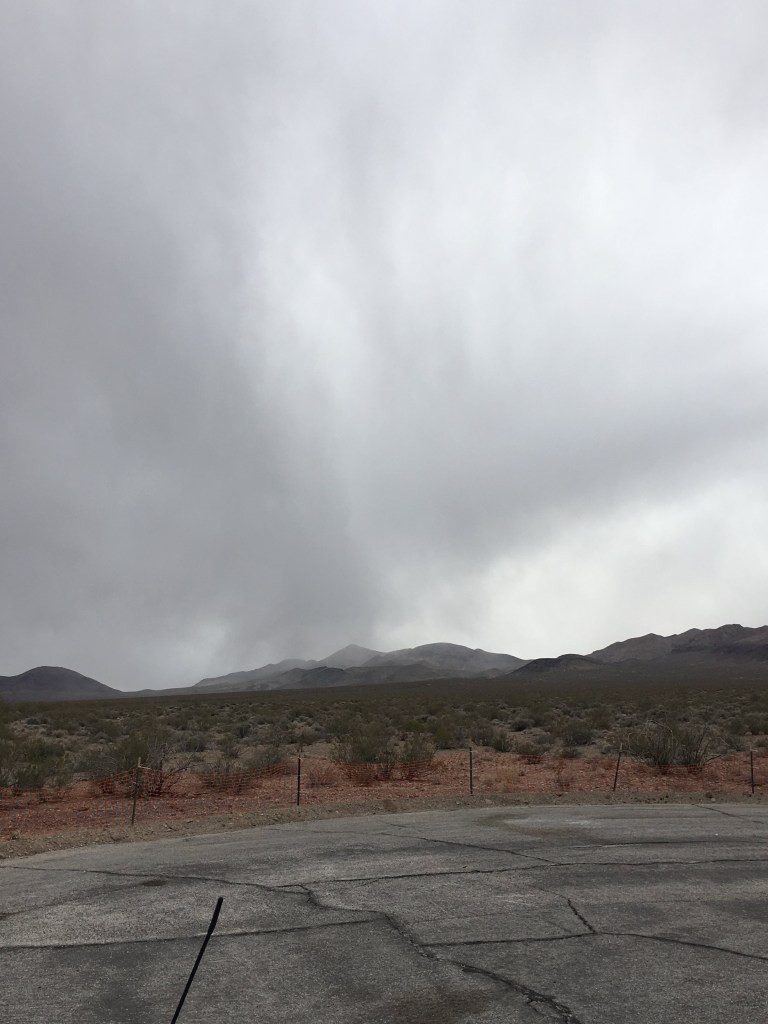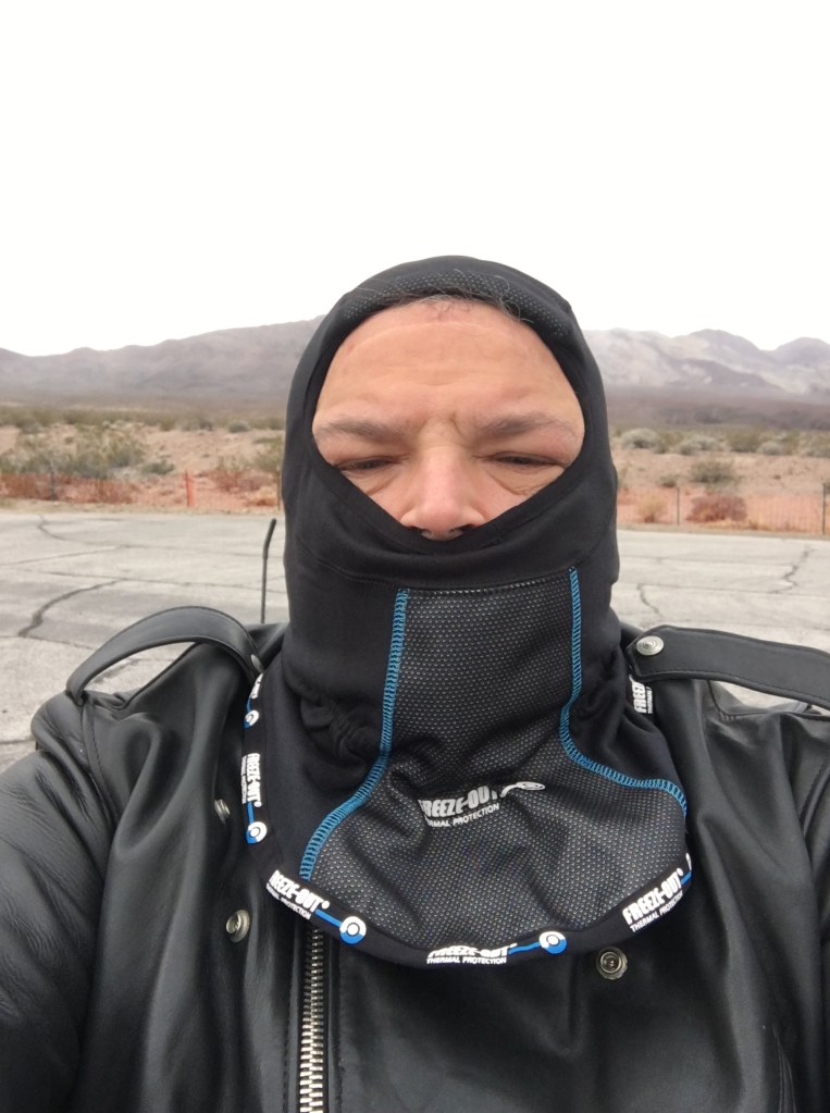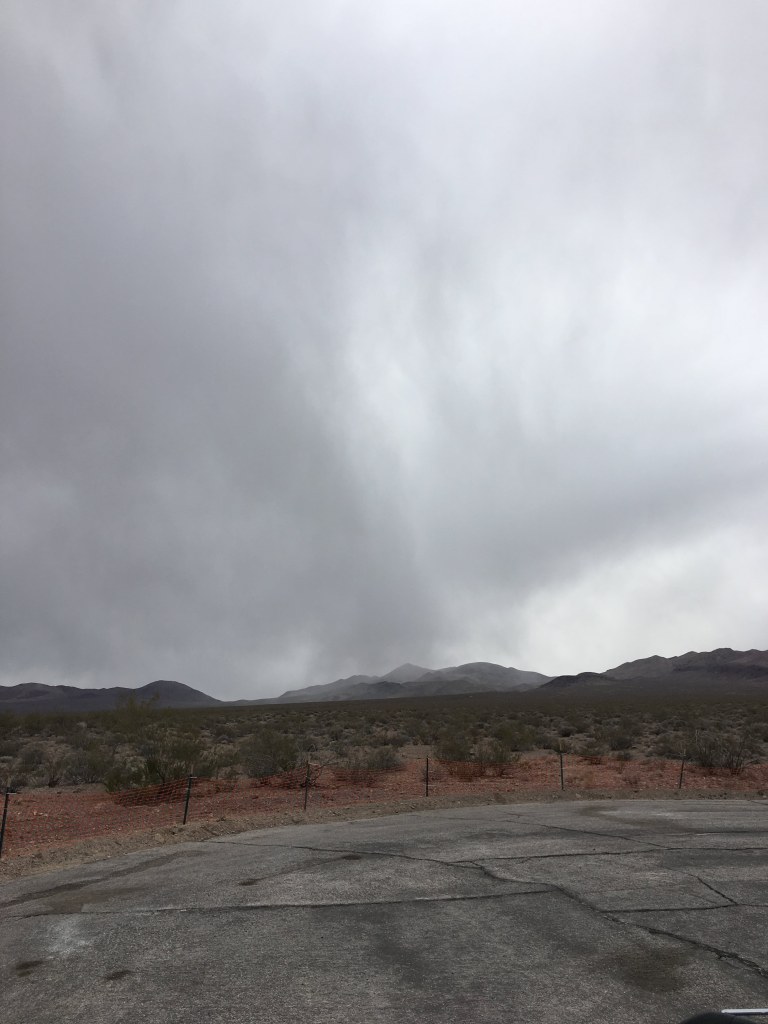 It was a chilly 35° F when I rolled out of Beatty, Nevada. I encountered snow twice on this trip, first time it was snowing (though most were evaporating before hitting the ground) near Dantes View and I ran into more light snow while fueling up in Shoshone, California. This snow was making it to the ground but was not accumulating much (thank God).