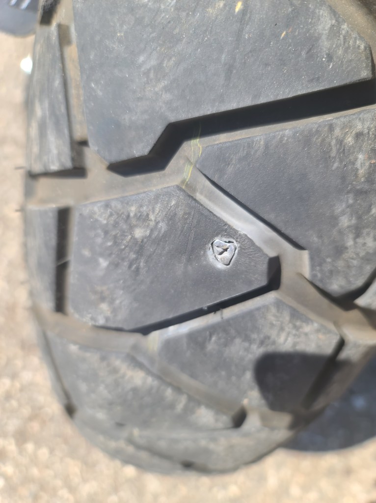 I quickly pulled over and accessed the situation and once the luggage was off Bruce and on its center stand, I discovered a sizable screw lodged deeply into the center of the rear tire, yep, that will cause a flat.