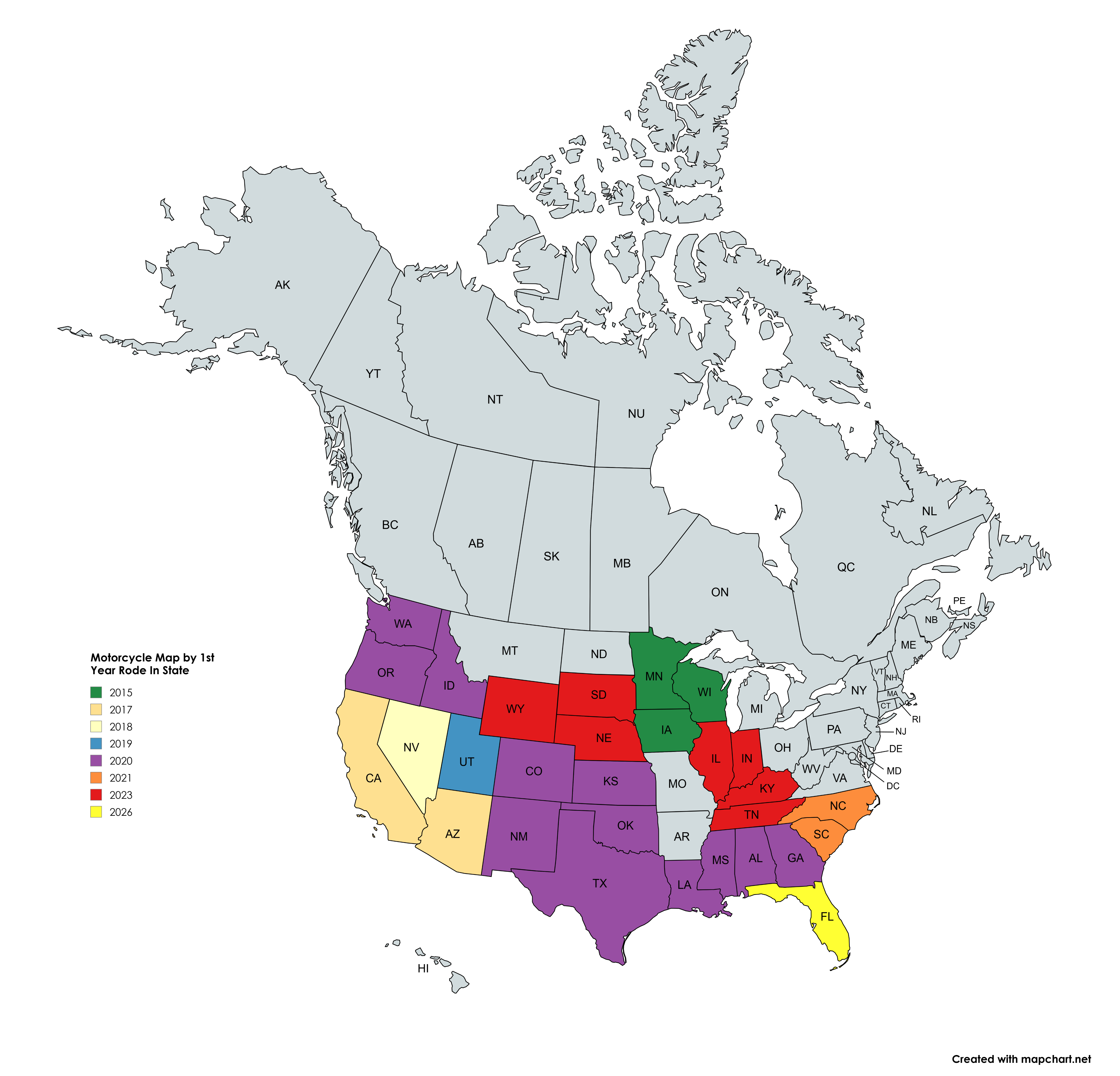 2026 Map – States based on the 1st year I have ridden a motorcycle in them.