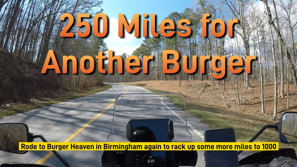 Today, February 14th, 2026, I rode 250 miles from Douglasville, Georgia to Brimingham, Alabama to grab a burger.